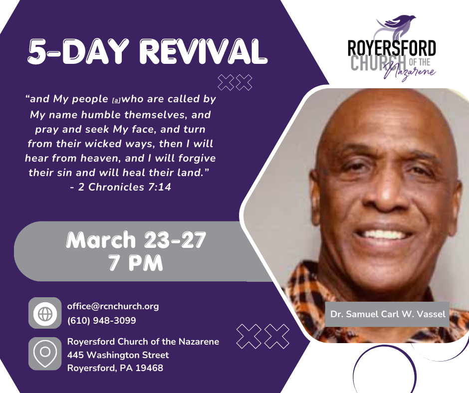 Our 5-Day Revival will take place at 7 pm in the RCN Family Life Center March 23-27, 2026.