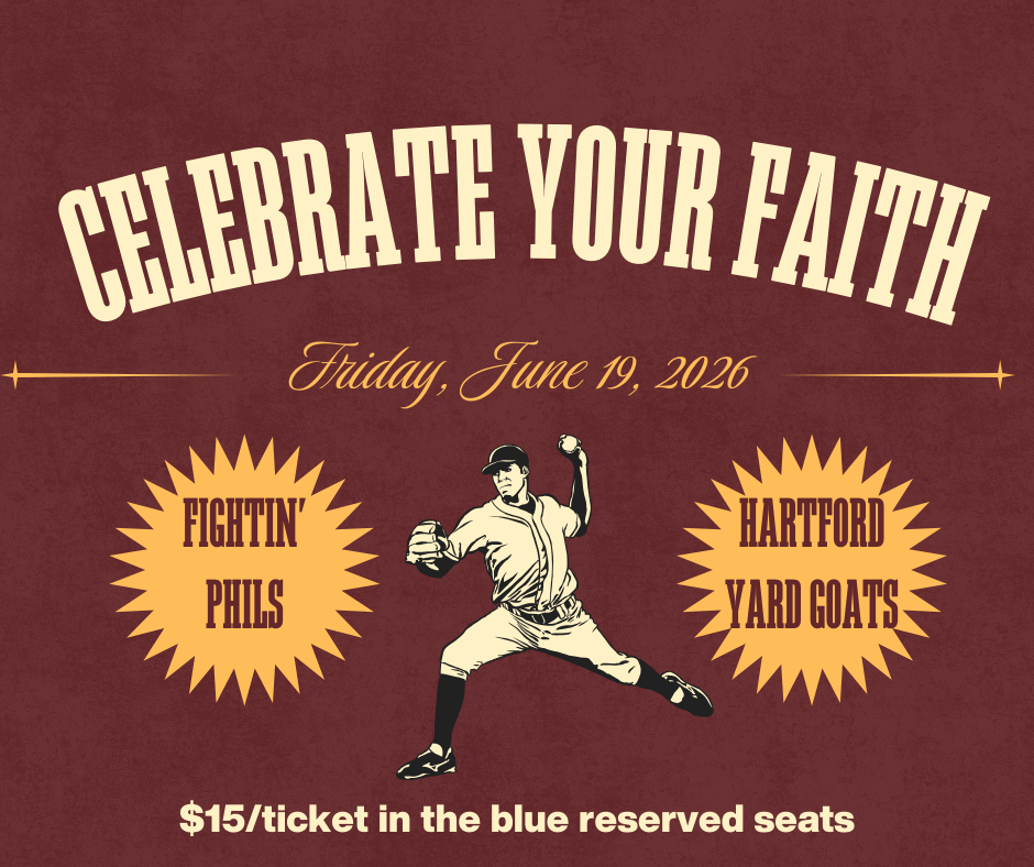 Join us on Friday, June 19, 2026 at 7 pm when the Reading Fightins' take on the Hartford Yard Goats. We will be leaving the Church at 5:30 pm.